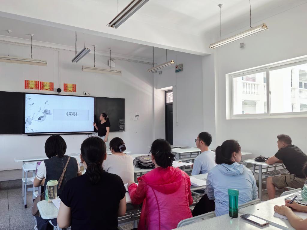 活动中,辛莹莹老师从诗歌意象、语言特色、情感表达等方面讲授了诗歌《采葛》。讲解生动细腻,富有感染力,展现了《诗经》的独特艺术魅力。课堂节奏张弛有度,教学手法多样,展现了教师扎实的文学功底和教学能力。